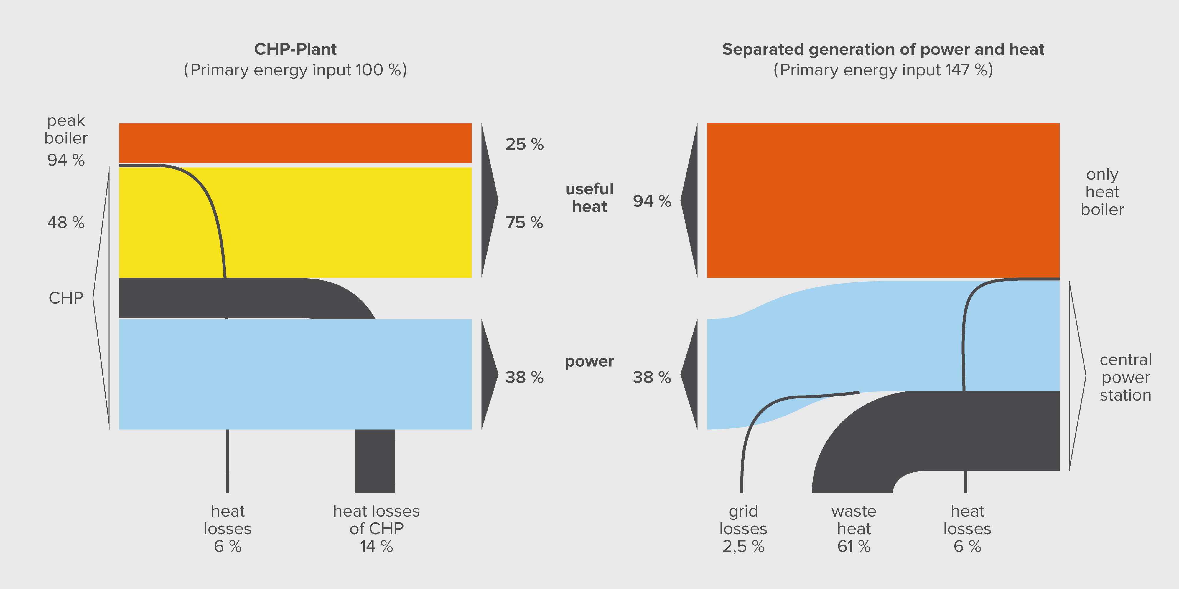 The principle of combined heat and power generation (CHP) means to convert the waste heat of power plants (heat of flue gas, the cooling loop and the lubricating oil in case of engines) to useful heat. In comparison to the application of a heat only boiler, the use of waste heat leads to primary energy savings. This quality of this effect shall be described with the help of the following plant example.