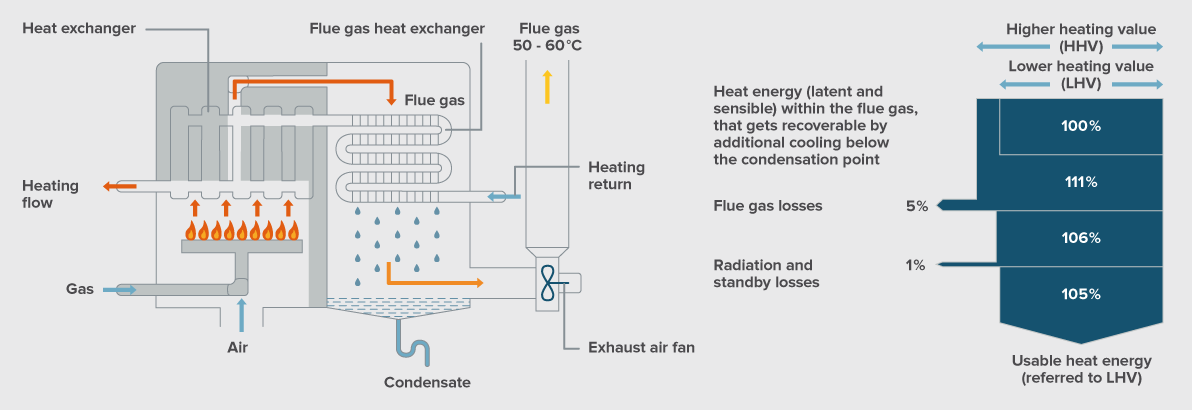 The condensing boiler is in principle a low temperature boiler, in which an additional heat exchanger is connected in the exhaust stream. This second heat exchanger cools the gas to below the condensation point (natural gas: 56 °C / gas oil: 47 °C). Thus, in addition, the (so-called latent) heat that is released in the condensation of water vapor, can be used. The relative degree of efficiency (relating to the calorific value) can be raised in this way to about 100% for natural gas and 95% for heating oil. The gas condensing boilers are now considered to be best available technology (BAT). They can usually also be realized in existing buildings through the use of titght and acid-resistant chimney (such as plastic pipe use).