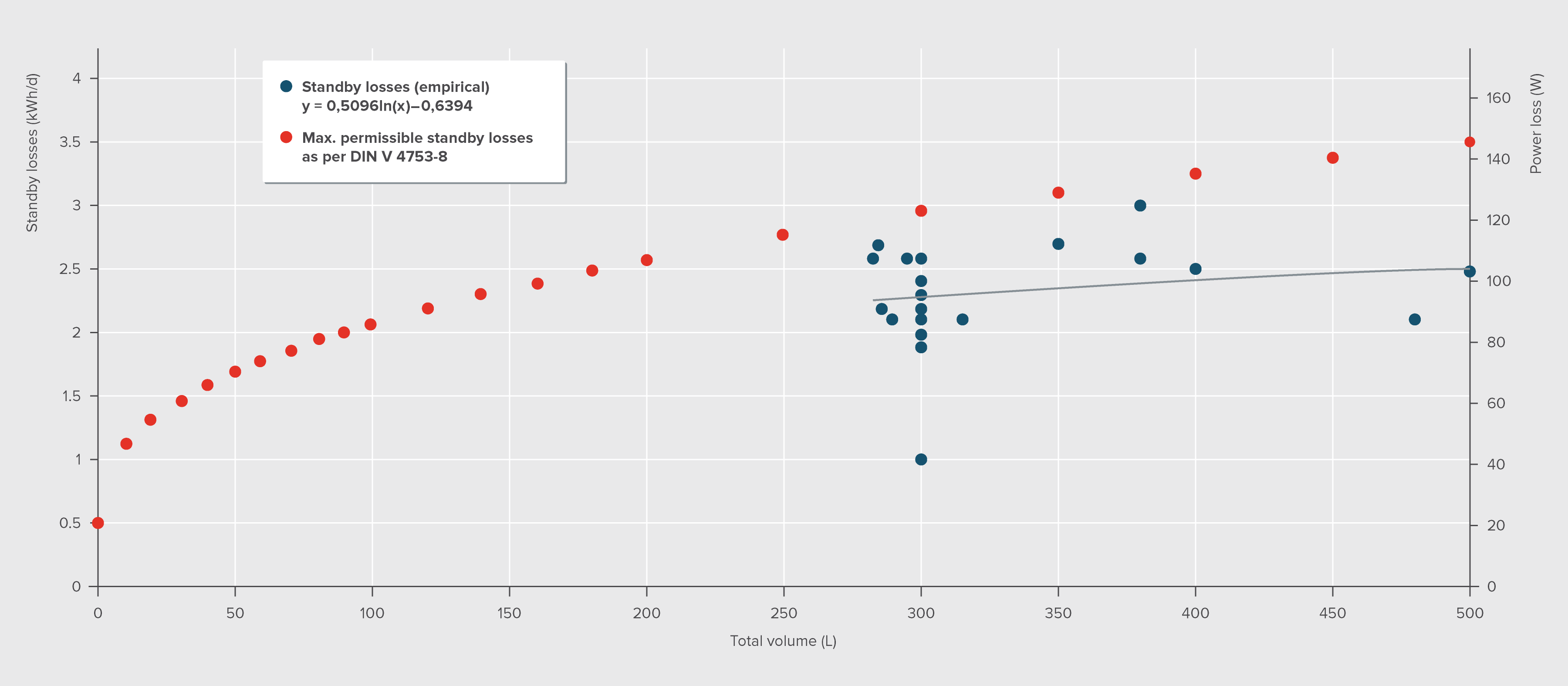 The load times for the storage tank should be set by an expert according to the proposed charging strategy. A loading strategy could be, for example within solar thermal systems, to avoid the filling of the water storage by a backup heat generator in times of potential solar yield (i.e. around midday). Another precept is: The lower the temperature level in the tank, the lower are the thermal losses. Moreover the efficiency of some heat generators, namely electric heat pumps, drops significantly with higher water temperatures. The storage design temperature is determined by the required flow temperature of the heating system. In case of DHW storage additionally hygienic aspects have to be considered: For small systems (≤ 400 litre of storage volume and a content of less than 3 litre in the pipes between the storage and the tap) as a rule 50 to 55°C are sufficient. Bigger systems (> 400 litre) should be heated once a day to a temperature of at least 60°C to avoid legionella colonies growth (DVGW.de, 2016). Fresh water stations (see figure below-right) generate DHW in an instantaneous flow and thus minimize hygienic risks.